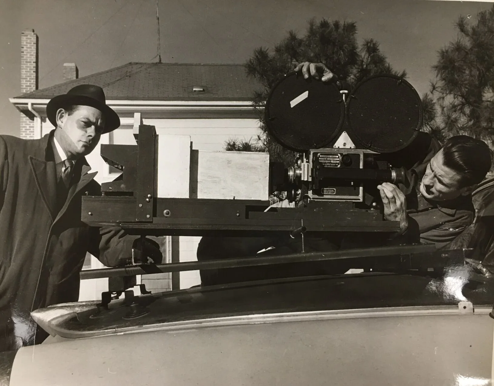 “Rowe Carney, left, and Tom F. Smith with the rotoscope camera they invented to show films in a 180-degree spectrum. They ilmed scenes throughout Missouri using the rotoscope in the 1950s and 1960s. They are today a stunning historical artifact of the era.